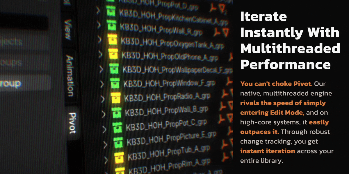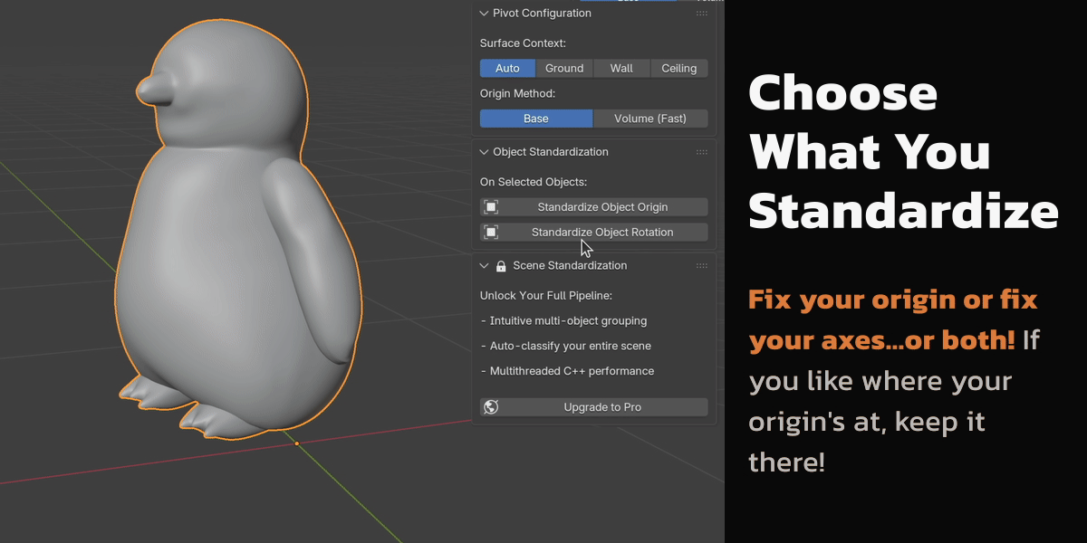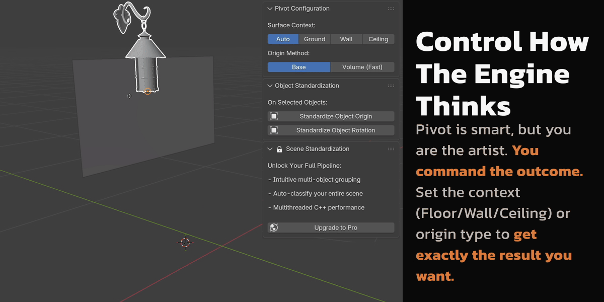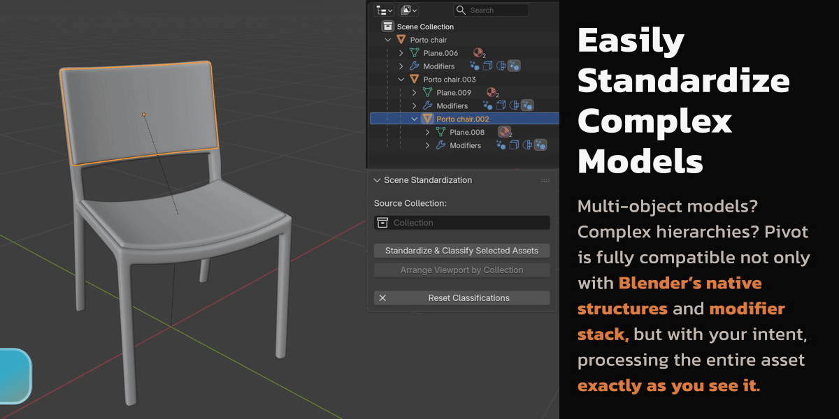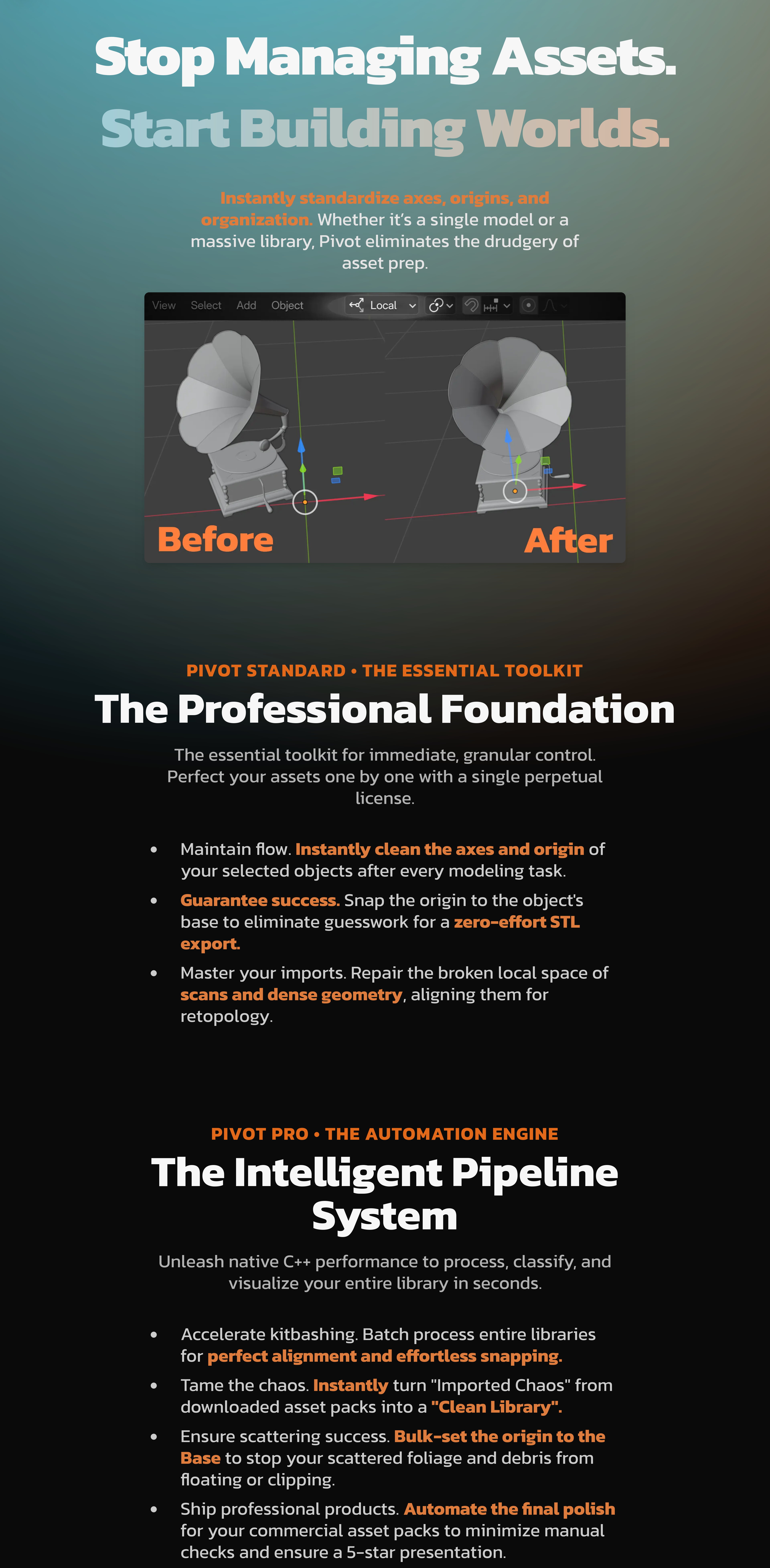 Pivot is the ultimate transform toolkit for Blender 4.2+, designed to automate the standardization of assets for game development, architectural visualization, 3D printing, modeling, and asset pack preparation.